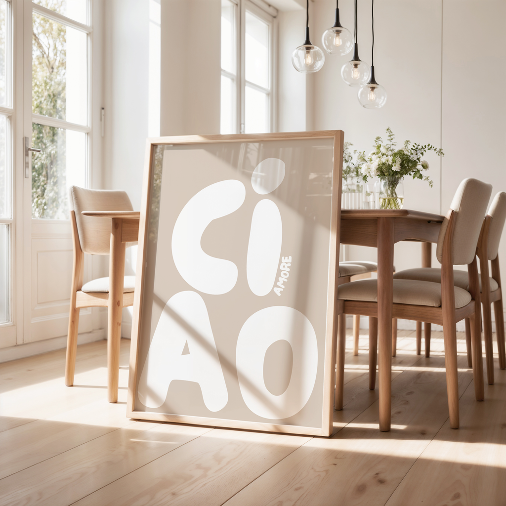 Italienisches Lebensgefühl für deine Wände: Mit dem verspielten Schriftzug „Ciao Amore“ bringt dieses Poster gute Laune, Leichtigkeit und einen Hauch von Dolce Vita in dein Zuhause.