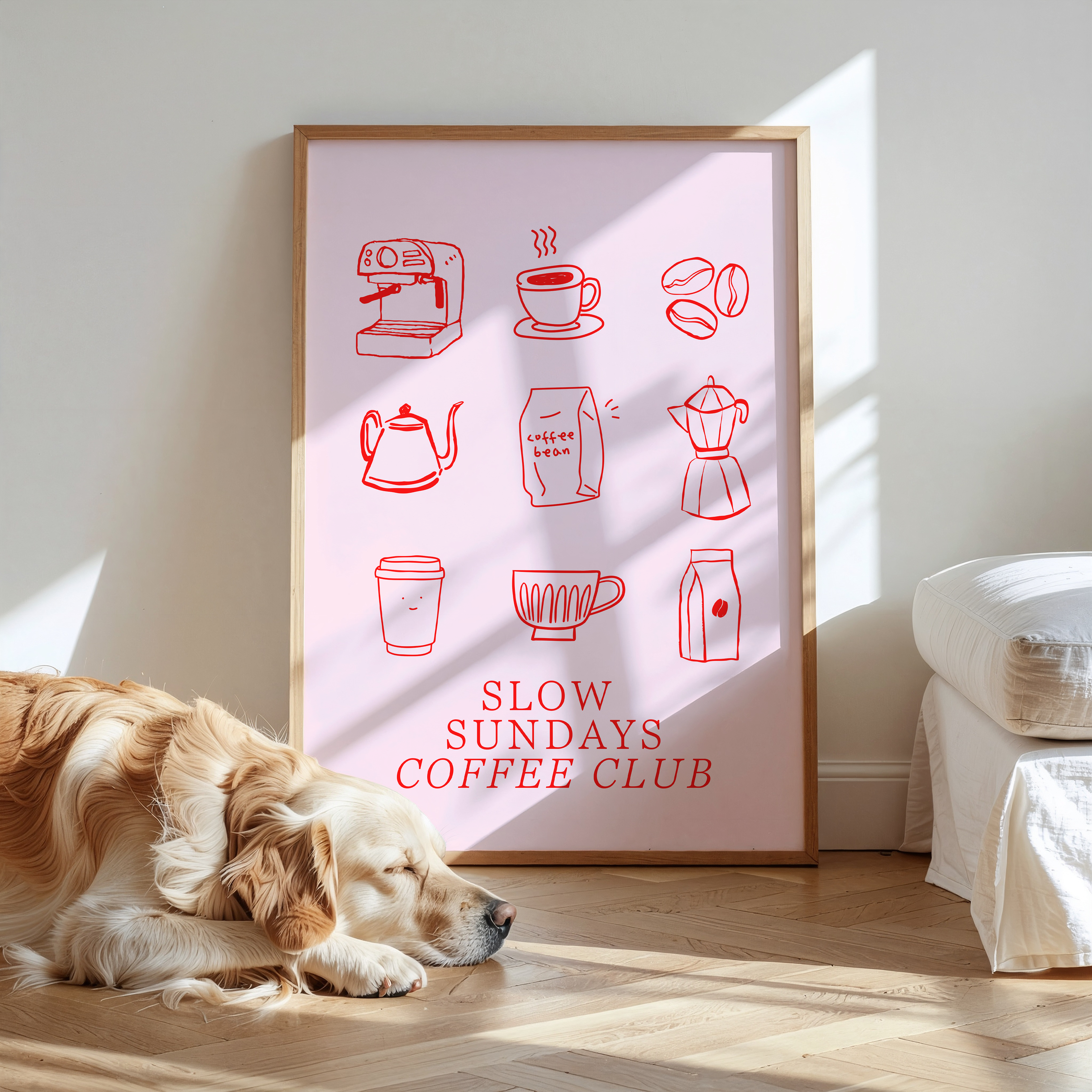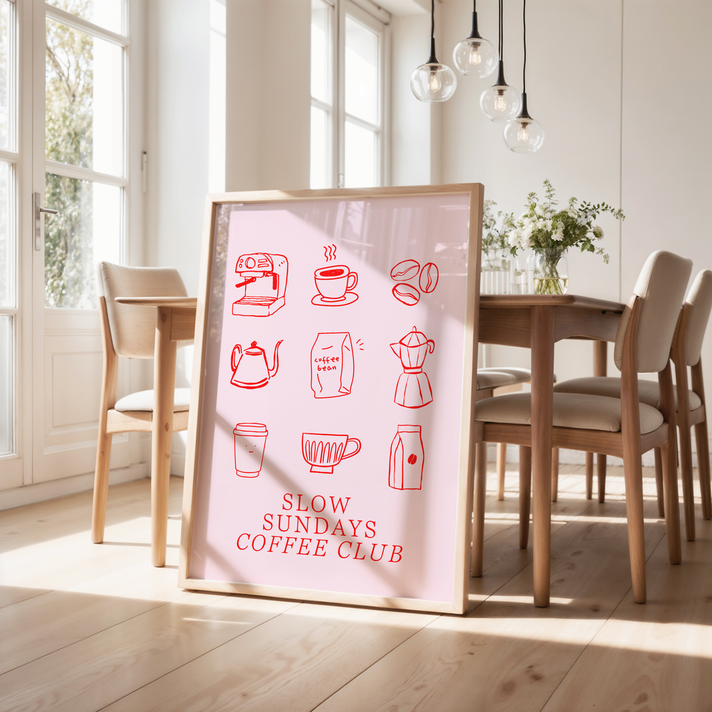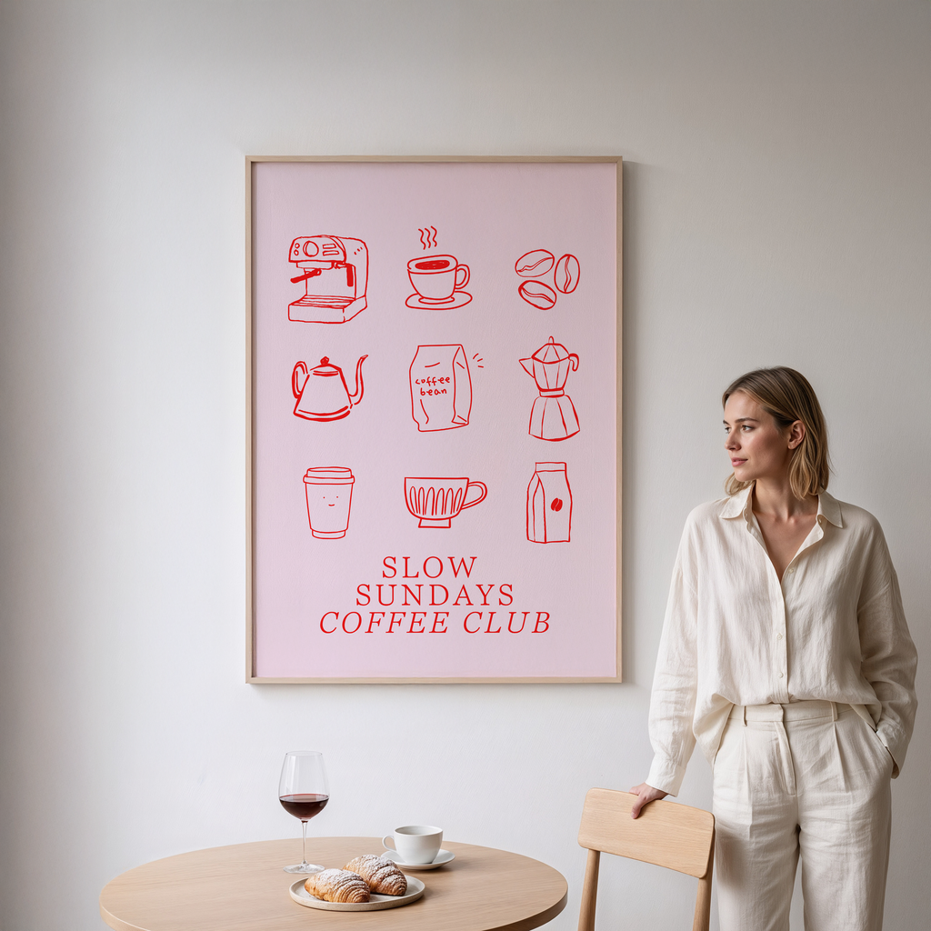 Gemütlichkeit pur – das Poster „Slow Sundays Coffee Club“ ist eine Hommage an entspannte Sonntage und die Liebe zum Kaffee. Mit seinen minimalistischen Illustrationen von Kaffeemaschine, Tasse, Bohnen & Co. bringt es den Duft von frisch gebrühtem Kaffee direkt in dein Zuhause.
