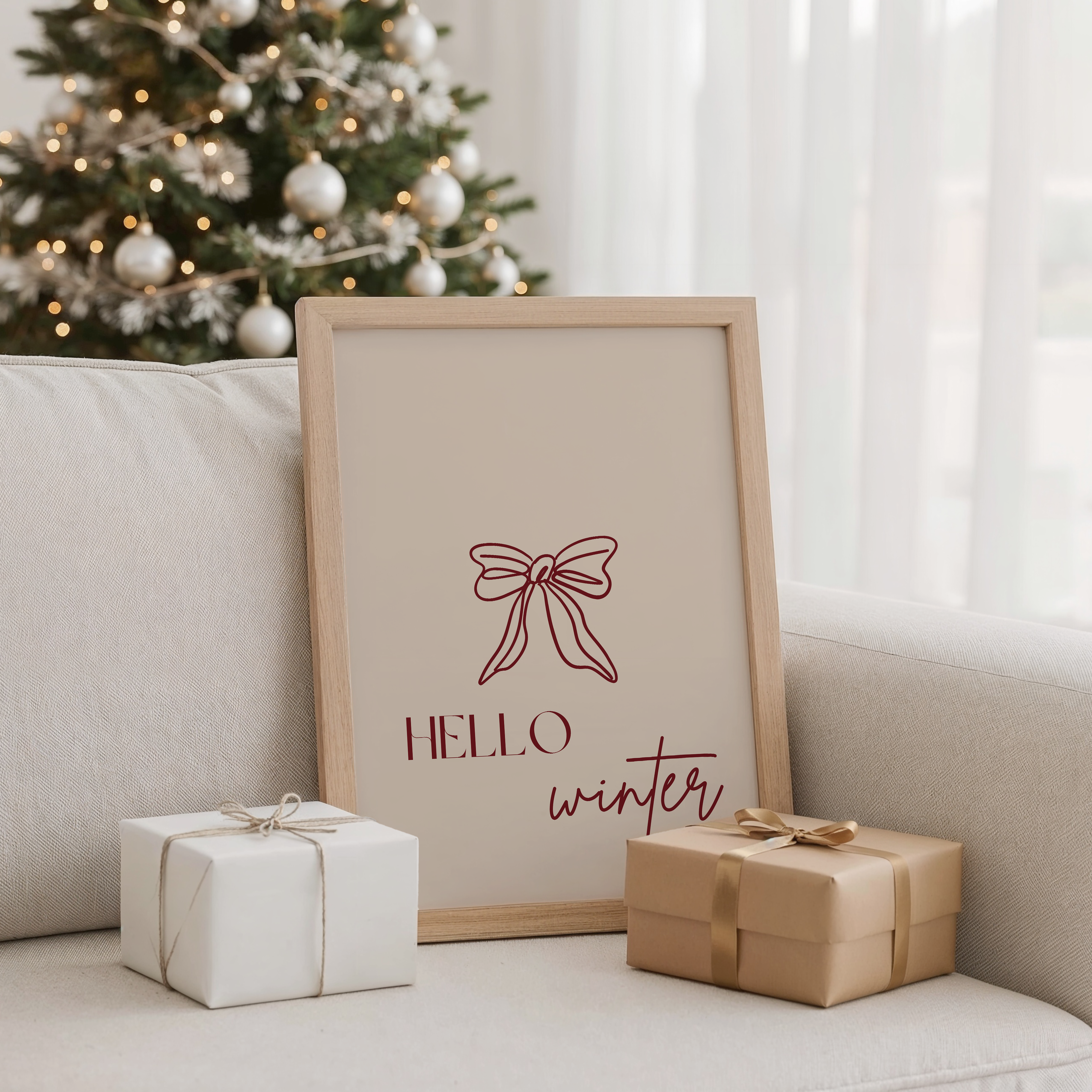 Begrüße die schönste Zeit des Jahres mit diesem modernen Winter-Poster! Die filigrane rote Schleife und der elegante Schriftzug verleihen jedem Raum eine stilvolle, saisonale Note – perfekt für den Übergang von Herbst zu Winter.