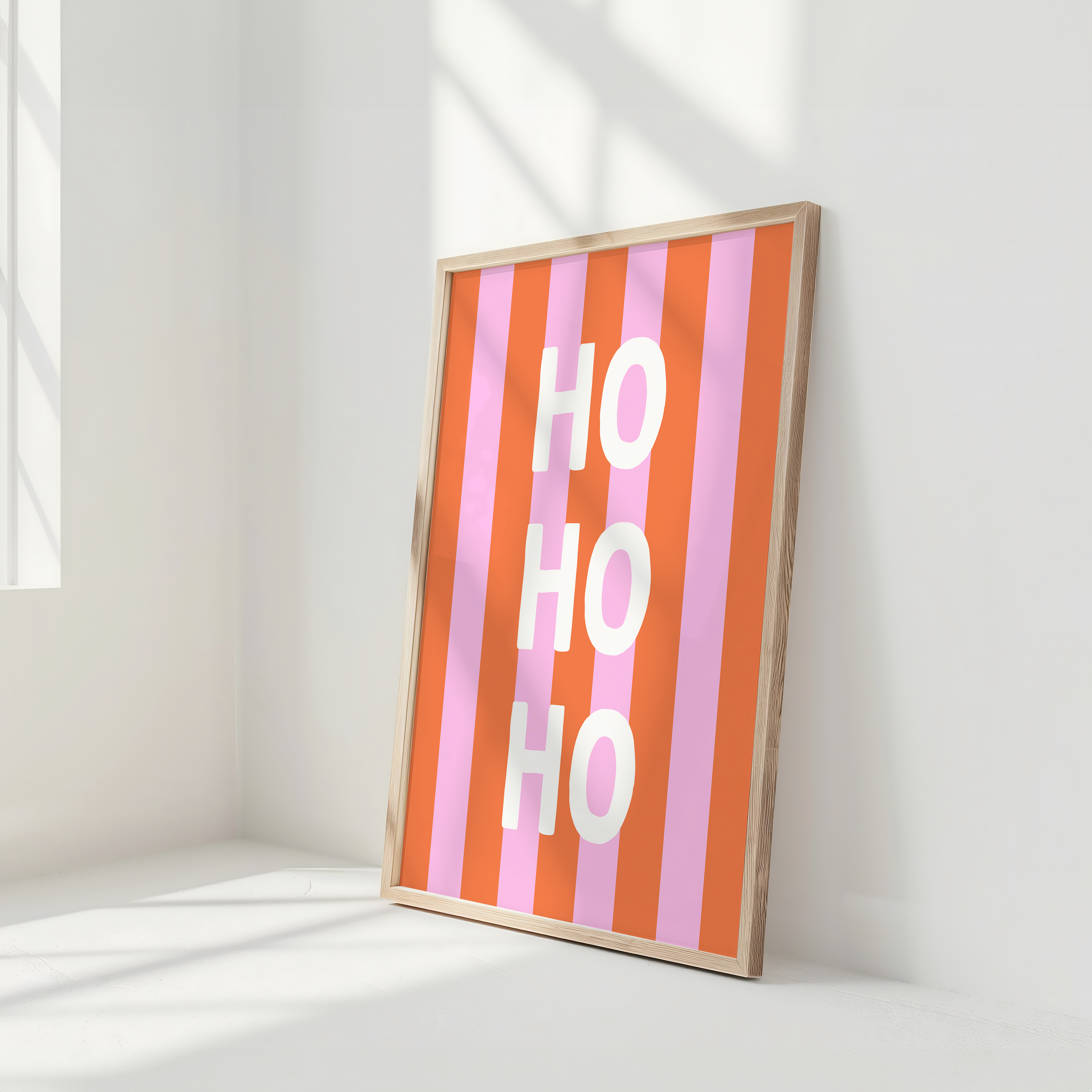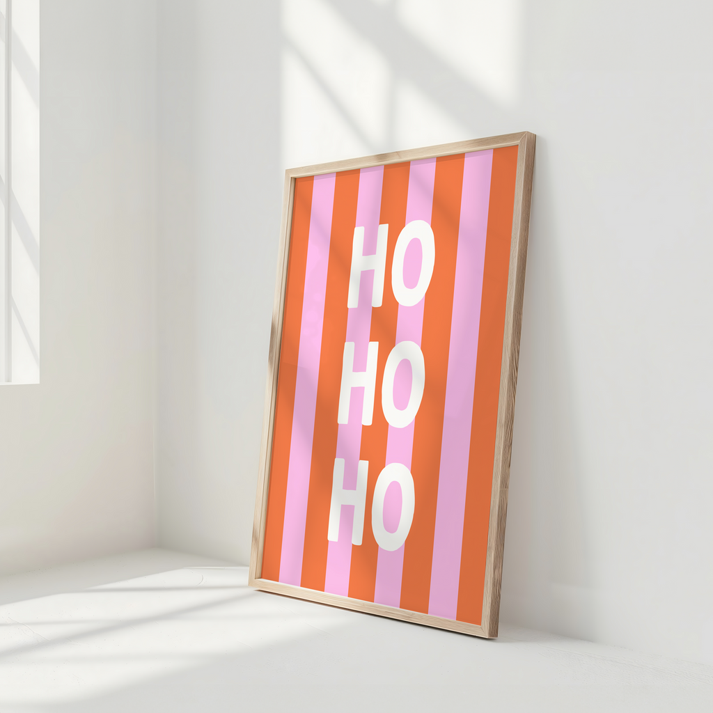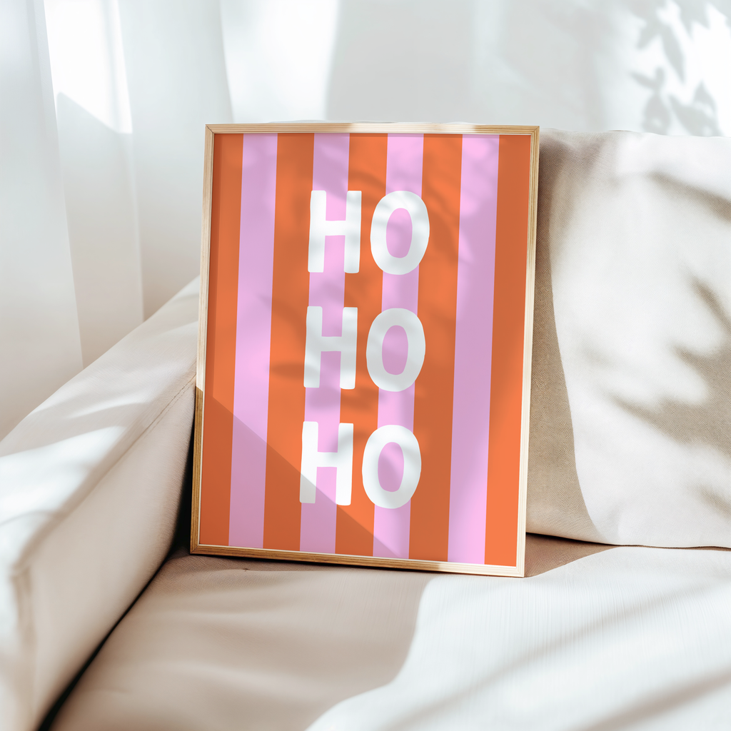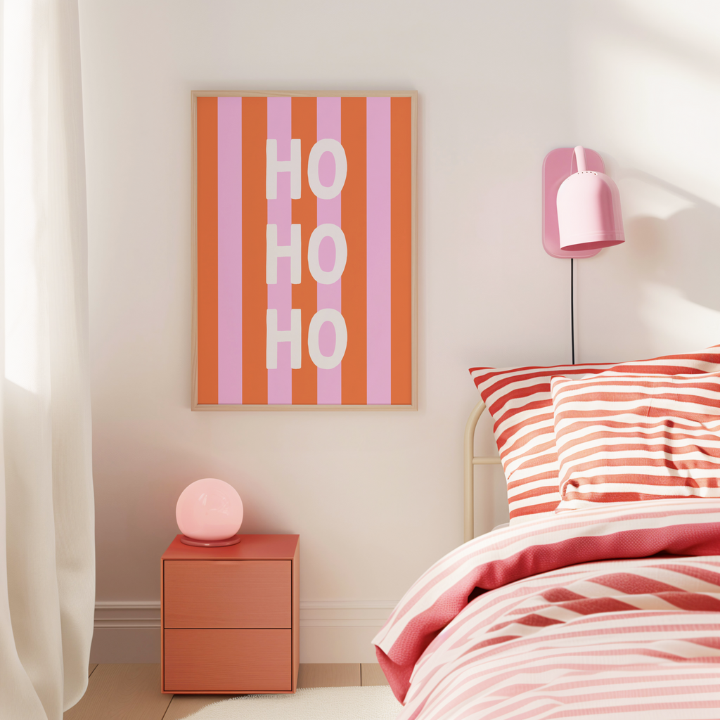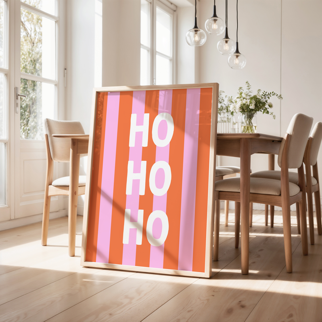 Unser „HO HO HO“ Poster verbindet klassische Weihnachtsfreude mit einem frischen, farbenfrohen Design. Die kräftigen orange-pinken Streifen und die klaren, weißen Buchstaben schaffen einen verspielten Retro-Look, der sofort gute Laune verbreitet.
