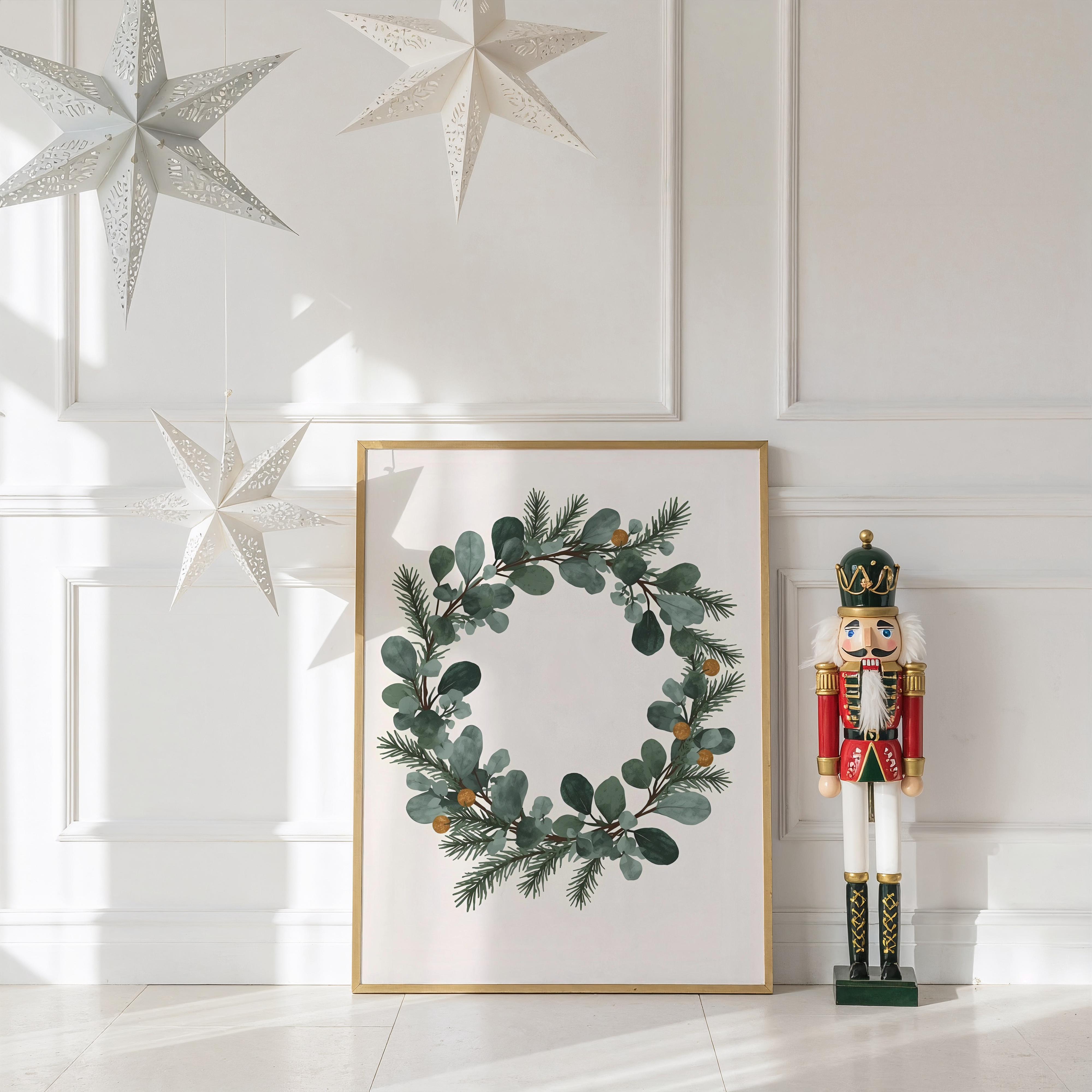 Ein wunderschöner, natürlicher Weihnachtskranz aus Eukalyptus- und Tannenzweigen – schlicht, elegant und perfekt für eine dezente Weihnachtsdeko. Der Print bringt winterliche Frische und Ruhe in dein Zuhause und passt ideal zu modernen, hellen Interiors.