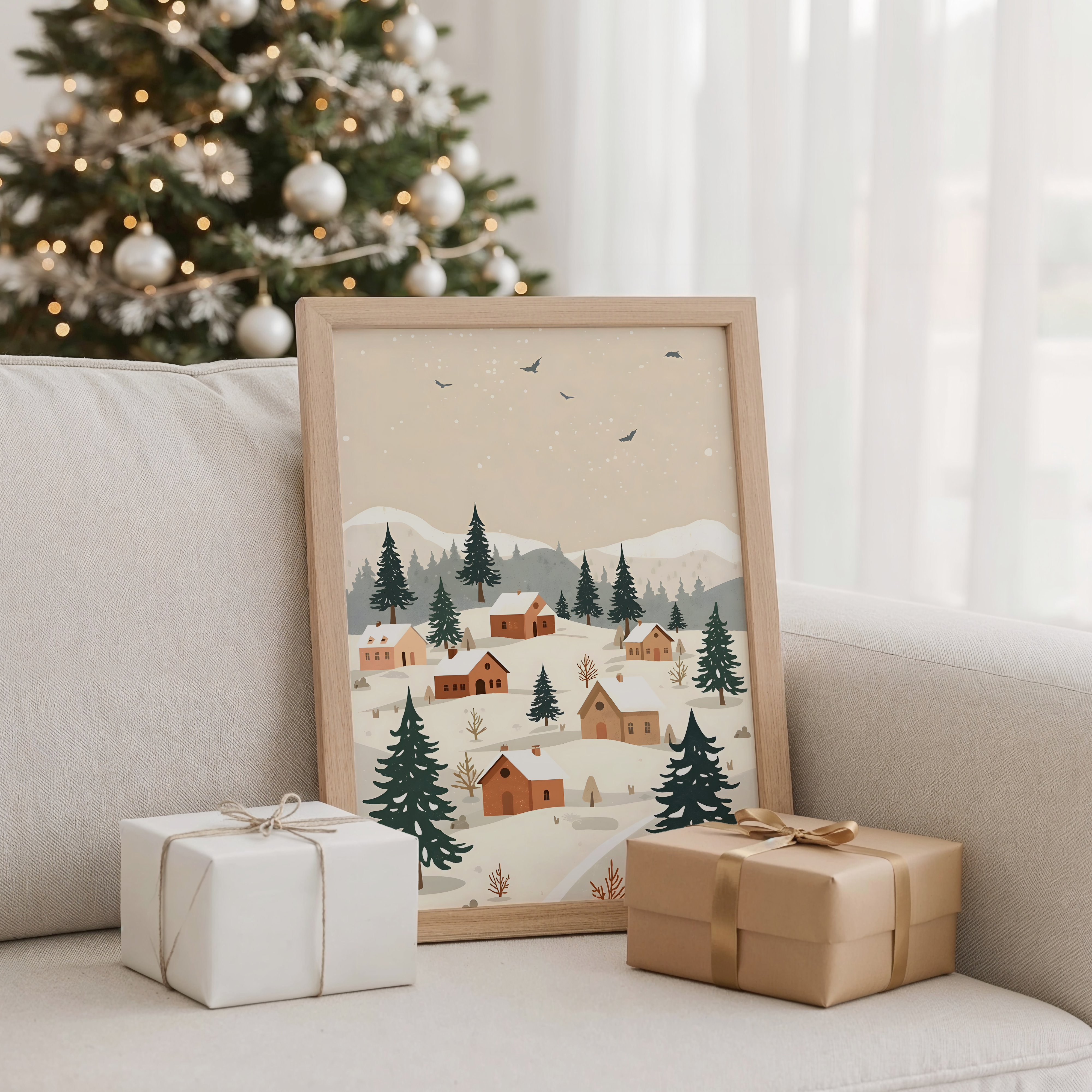 Tauche ein in die ruhige Magie eines verschneiten Dorfes. Dieser sanft illustrierte Print zeigt kleine Holzhäuser, Tannen und Berge – in warmen Naturfarben, die Gemütlichkeit und Frieden ausstrahlen. Ideal für alle, die nordische Weihnachtsstimmung lieben.